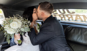 Rosie and Steve share a romantic kiss in their classic car upon arriving at Liuna Station.