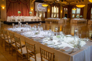 Rosie and Steve's beautifully arranged wedding reception at Liuna Station, featuring elegant table settings and ambient lighting.