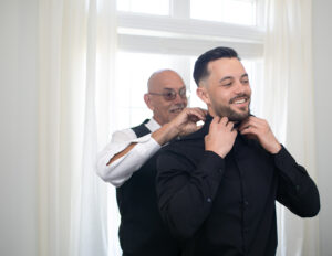 Steve receives a helping hand with his suit from his dad at his Liuna Station wedding.