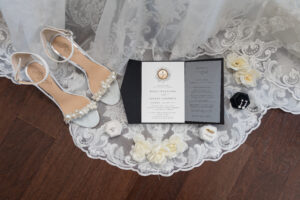 A beautiful flat lay featuring bridal shoes, invitation, and lace accents from Rosie and Steve's enchanting wedding at Liuna Station.
