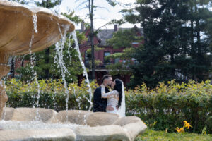 Rosie and Steve share a romantic kiss by the water fountain at Liuna Station, surrounded by lush greenery and historic architecture.