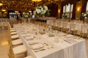 The stunning table setup at Rosie and Steve's wedding at Liuna Station, featuring elegant florals and classic gold accents.