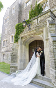 A stunning moment captured during Rosie and Steve's wedding photo session at McMaster University, showcasing the couple in front of the historic stone architecture.