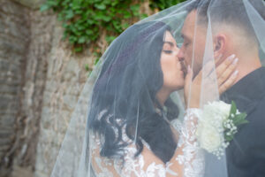 Rosie and Steve share a tender kiss beneath the veil during their wedding photo session at McMaster University.